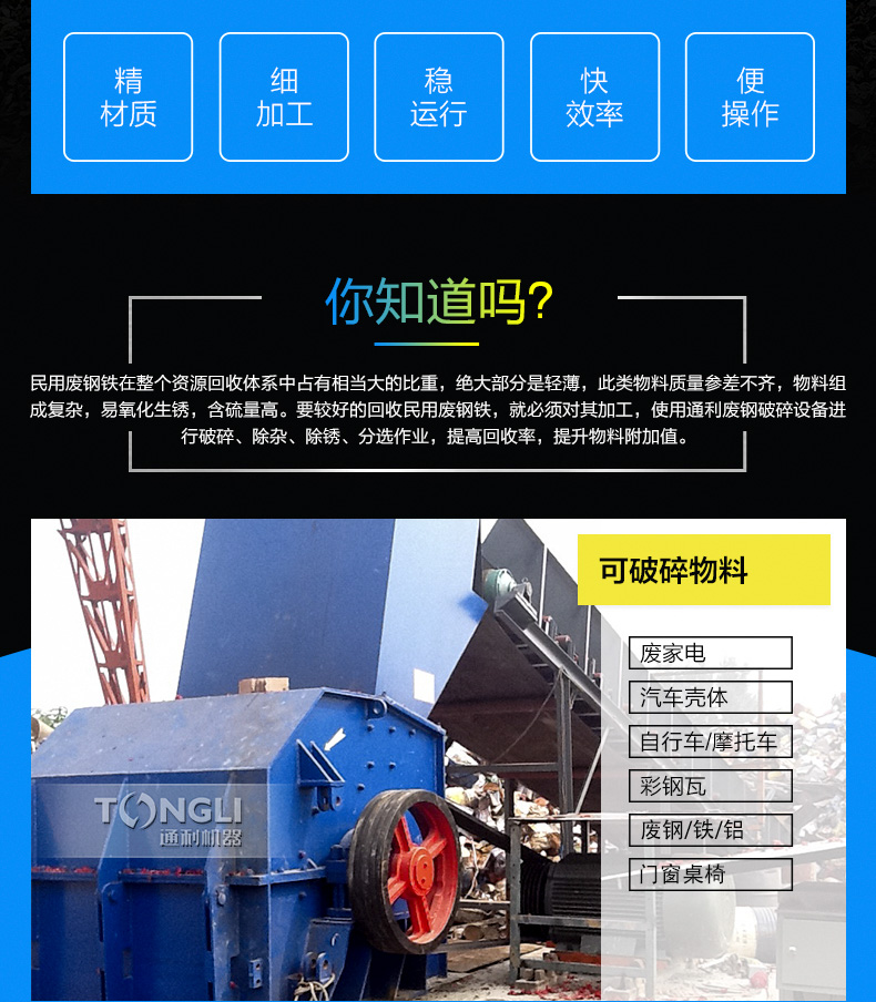 废钢破碎机是结合市场需求而成的产品。主要针对量废弃金属的再生利用,进行预破碎处理,并清理表面的油漆和污垢。该机产能每小时4-5T。
