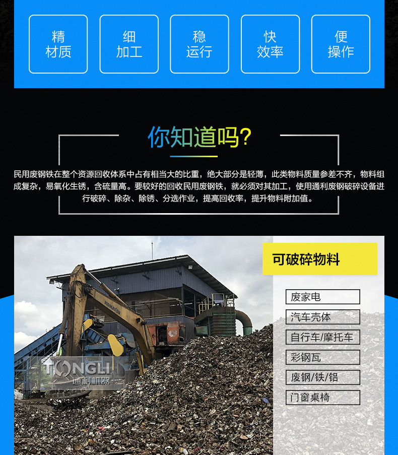 废钢破碎机是结合市场需求而成的产品。主要针对量废弃金属的再生利用,进行预破碎处理,并清理表面的油漆和污垢。该机产能每小时8-12T左右。