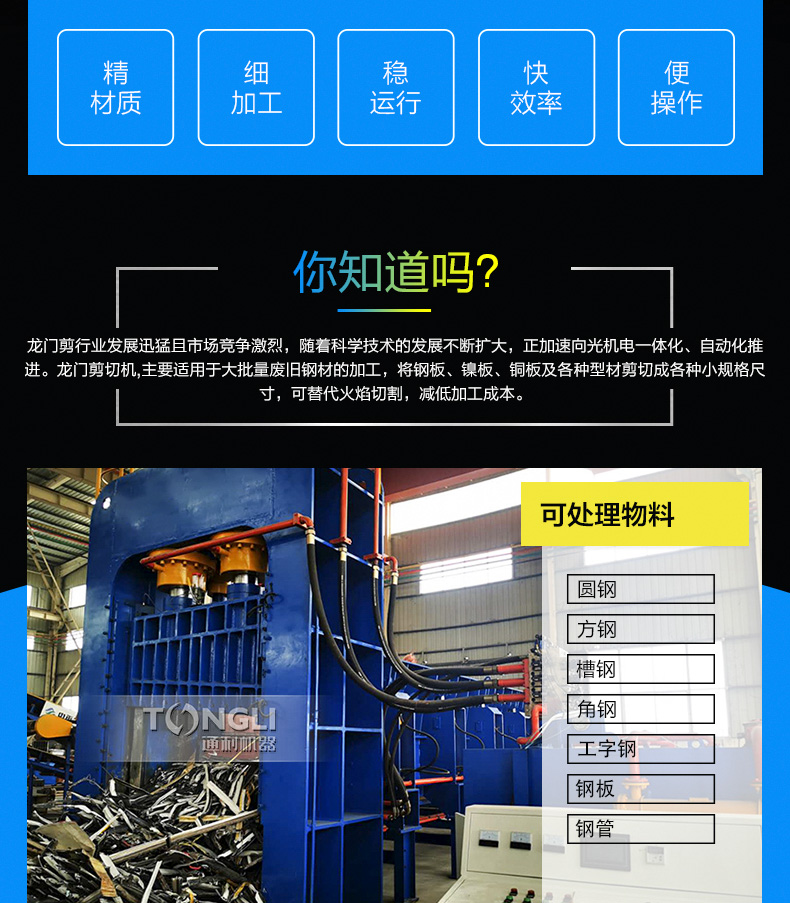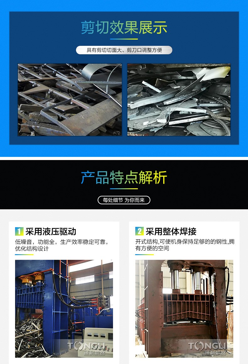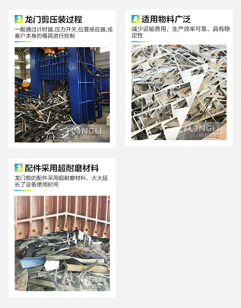 该系列龙门剪切机适用于金属回收加工厂、报废汽车拆解场、冶炼铸造行业,对各种形状的型钢、角钢、槽钢、圆钢、钢坯、铁丝、铁板、铜板、铝板、钢丝绳、螺纹钢、切割下角铁、等各种结构进行冷态切碎,加工成合格炉料。