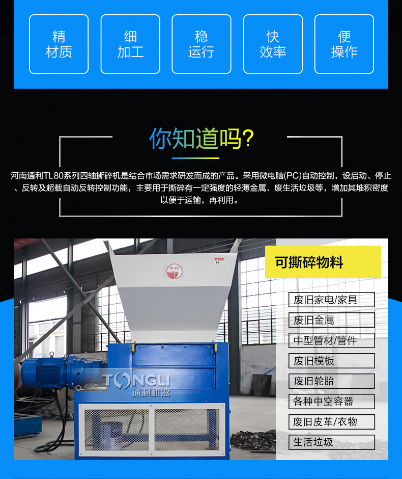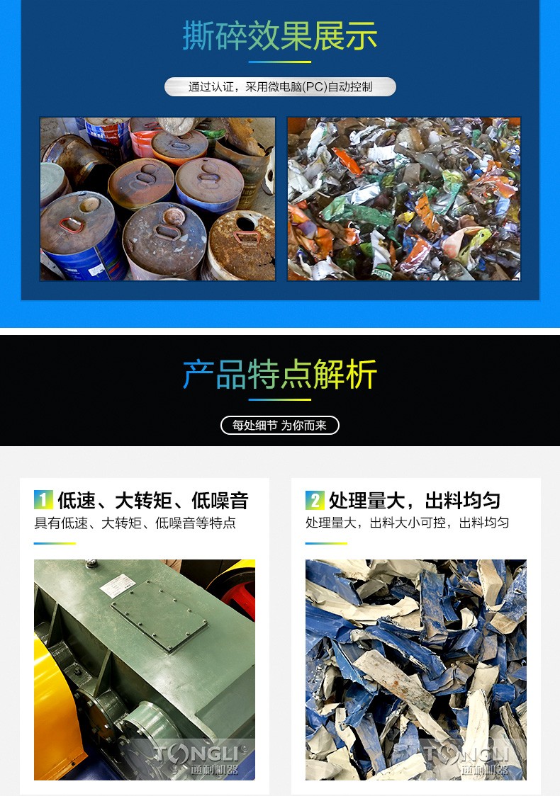 四轴撕碎机是结合市场需求而成的产品。采用微电脑(PC)自动控制,设启动、停止、反转及载自动反转控制功能,主要用于撕碎有一定强度的轻薄金属、废生活垃圾等,增加其堆积密度以便于运输,再利用。