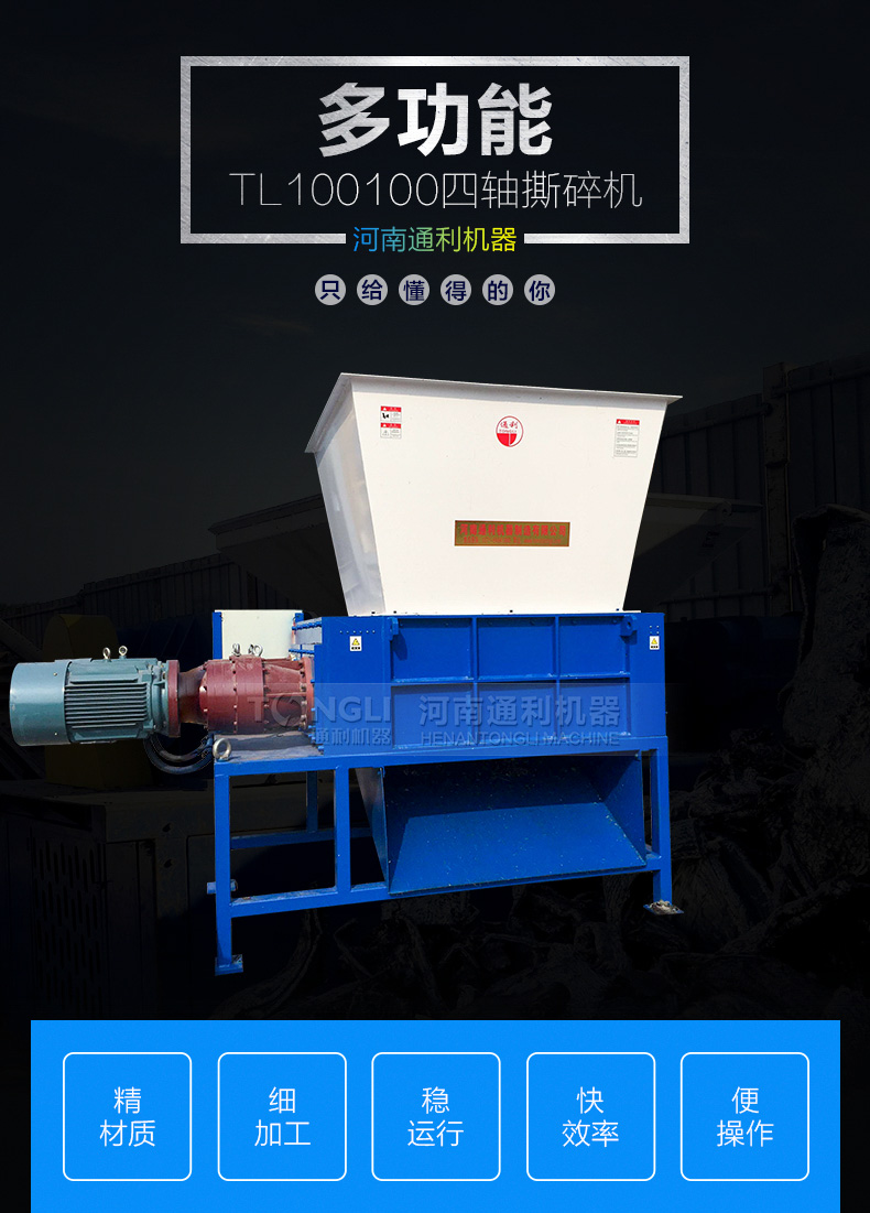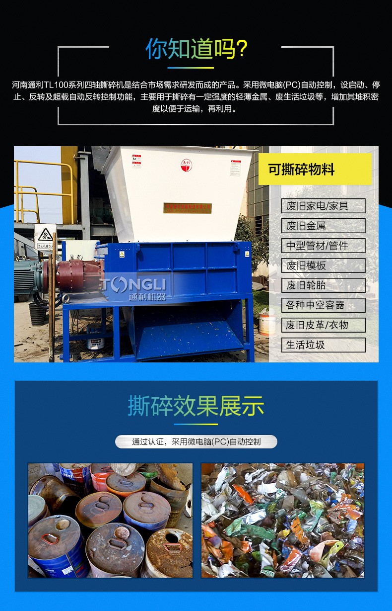 四轴撕碎机是结合市场需求而成的产品。采用微电脑(PC)自动控制,设启动、停止、反转及载自动反转控制功能,主要用于撕碎有一定强度的轻薄金属、废生活垃圾等,增加其堆积密度以便于运输,再利用。